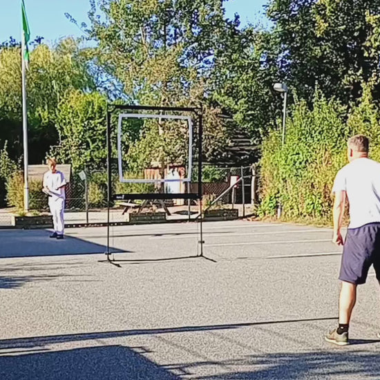 Start med to spillere og én af de tre bolde/fjerbolde som medfølger i alle spillesæt. Placér jer med cirka 1 meters afstand til nettet på hver side. Spil skiftevis gennem den hvide markererede åbning i nettet. Som i badminton og bordtennis, men her spilles igennem nettet.
