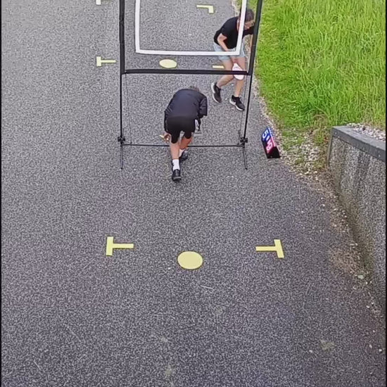 Der følger officielle banemål og spilleregler med i alle spillesæt – men du bestemmer selv, hvor præcis du vil være. Ønsker du at markere banen, kan du tilkøbe gule banemarkører i shoppen – perfekte til asfalt, terrasse eller indendørs.